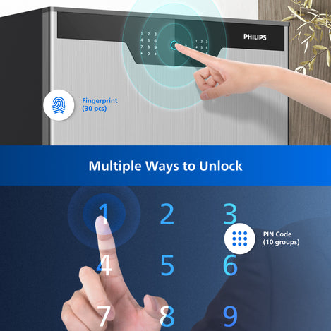 Experience faster, smoother access with biometric unlocking. The built-in touch panel supports both fingerprint and PIN code entry, activating with a light touch for quick identification.